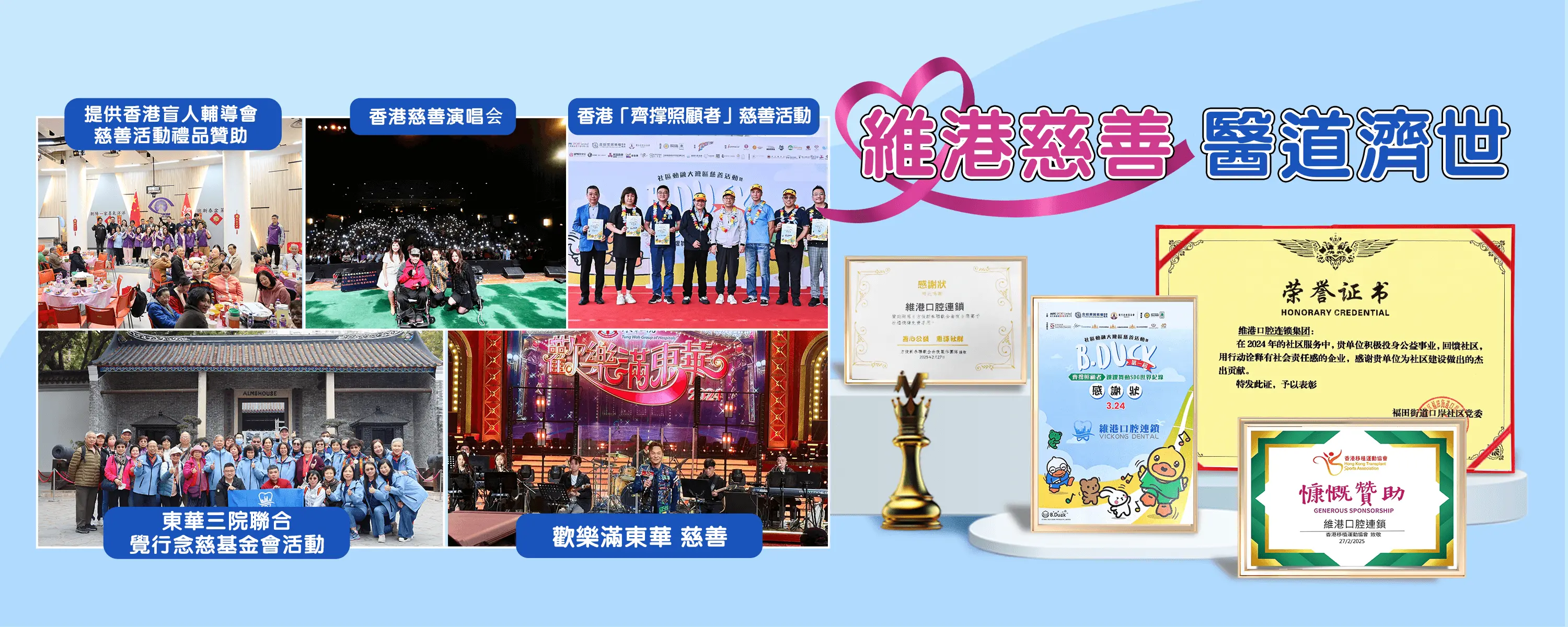 維港口腔連鎖注重服務質素,設立專業化接診流程,為超過兩百萬顧客提供免費術前CT檢查,國際品級嘅服務質素讓維港口腔連鎖長期佔據好評榜榜首。維港口腔連鎖每年為香港市民提供免費寫春聯活動,以及每年喺口岸社區開展義診活動、傳統文化培訓、助力殘障人士、設立長者關愛基金等。十六年來,長期惠利超過500萬大灣區市民,為市民口腔健康,做出卓越貢獻,榜樣引領示範行業,肩負企業社會使命。
